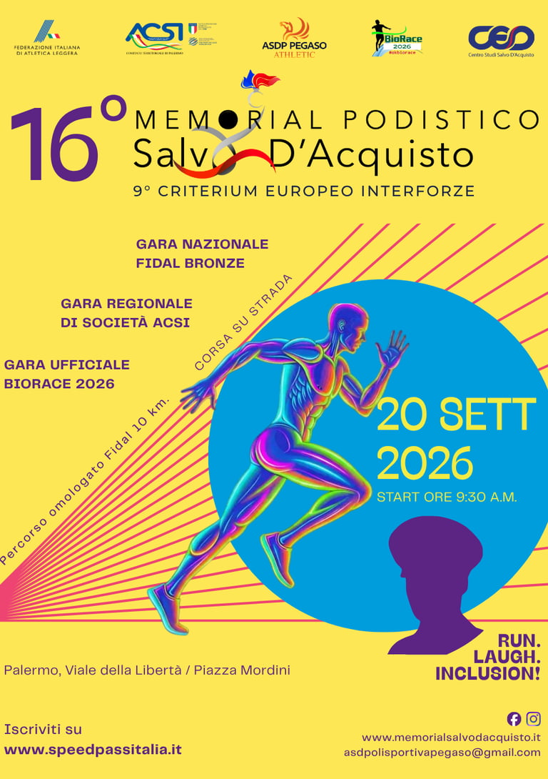 Il Memorial “Salvo D’Acquisto” è un grande evento sportivo che suscita grandi consensi sia nel mondo sportivo che tra la cittadinanza, la quale vede nella manifestazione non soltanto una gara podistica ma qualcosa di magico e indescrivibile che regala tanto colore spettacolo e sorprese sia ai visitatori che agli atleti che annualmente invadono il circuito ricavato lungo il prestigioso Viale della Libertà di Palermo coccolati dal primo all’ultimo arrivato in un via vai tanto bello che sorprendente; ognuno di loro al termine dei cinque giri da 2 Km. riceveranno il ricco pacco gara e racconteranno le proprie emozioni, le fatiche e le sensazioni che soltanto i 10km della gara palermitana sanno regalare.
